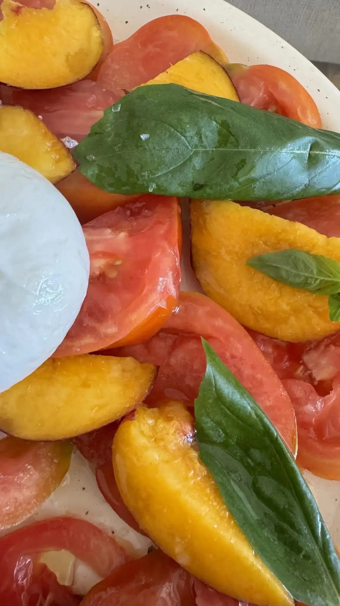 Encima ponemos los gajos de nectarina (puedes poner uno por cada tomate o algunos gajos menos).